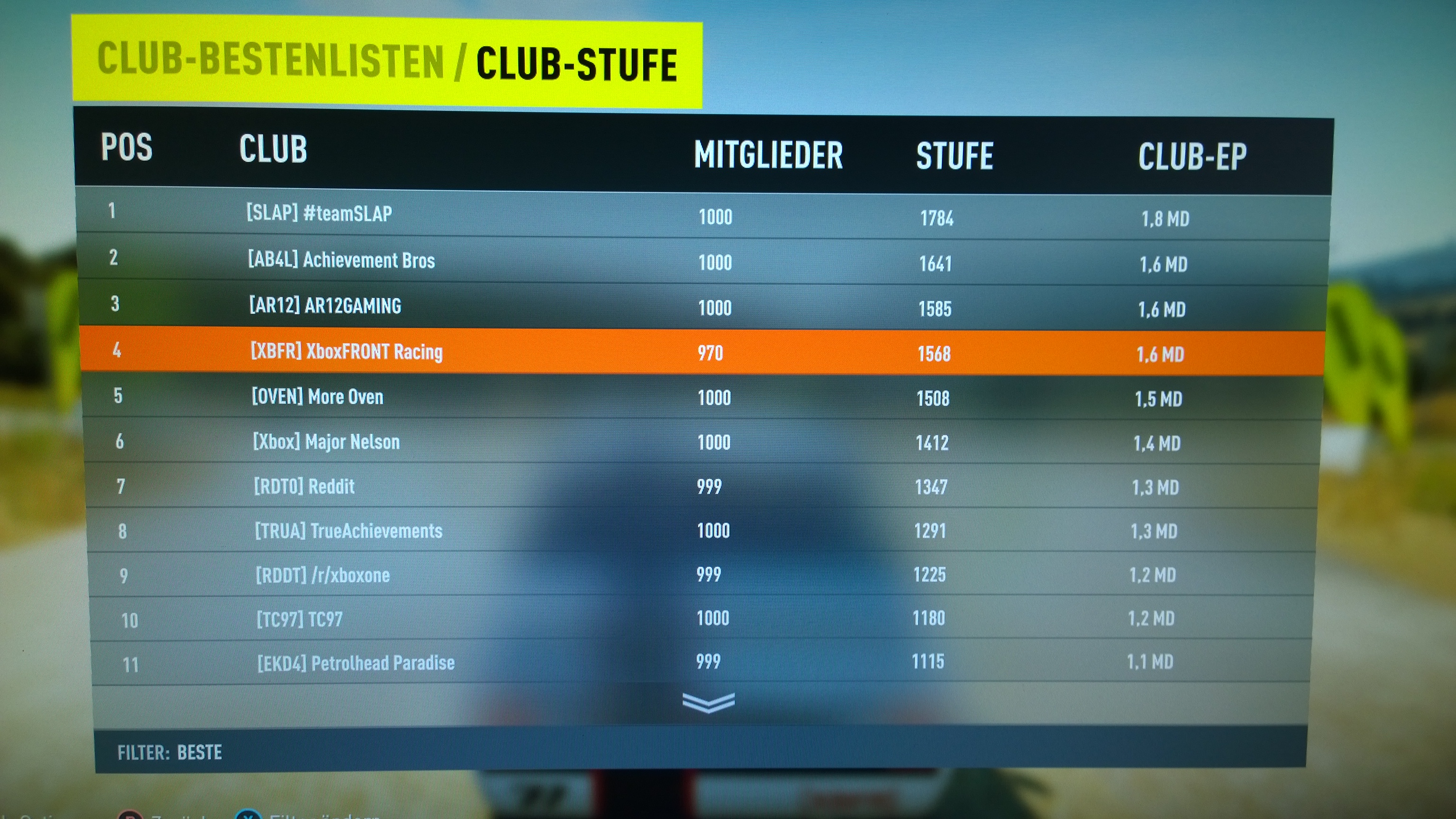 Um auf die Spielerliste zu kommen, bitte eater84 eine PM schicken. Dieser fügt euch hinzu. Wäre doch schön wenn man von den 1000 Mitgliedern doch mal ein paar kennen würdeIch möchte an dieser Stelle noch was Werbung machen für [XBFR] XboxFRONT-Racing Spielerliste (je mehr desto besser) und auch für [XBFR] Forza Horizon 2 Spielerverabredungen / Onlineveranstaltungen (hier ist regelmäßig was los)