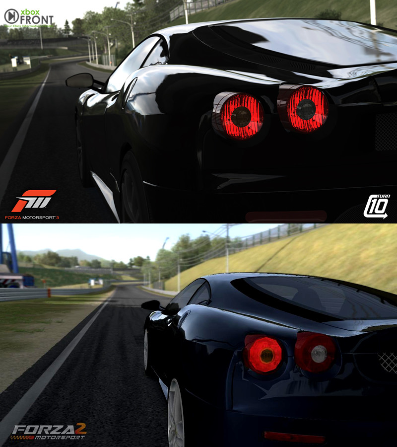allein wenn man sich die Rückleuchten beim ersten Vergleichsbild anschaut bemerkt man den Unterschied extrem. Während es bei Forza² noch unnatürlich kantig ist, wirken die Rückleuchten bei Teil3 wie original.