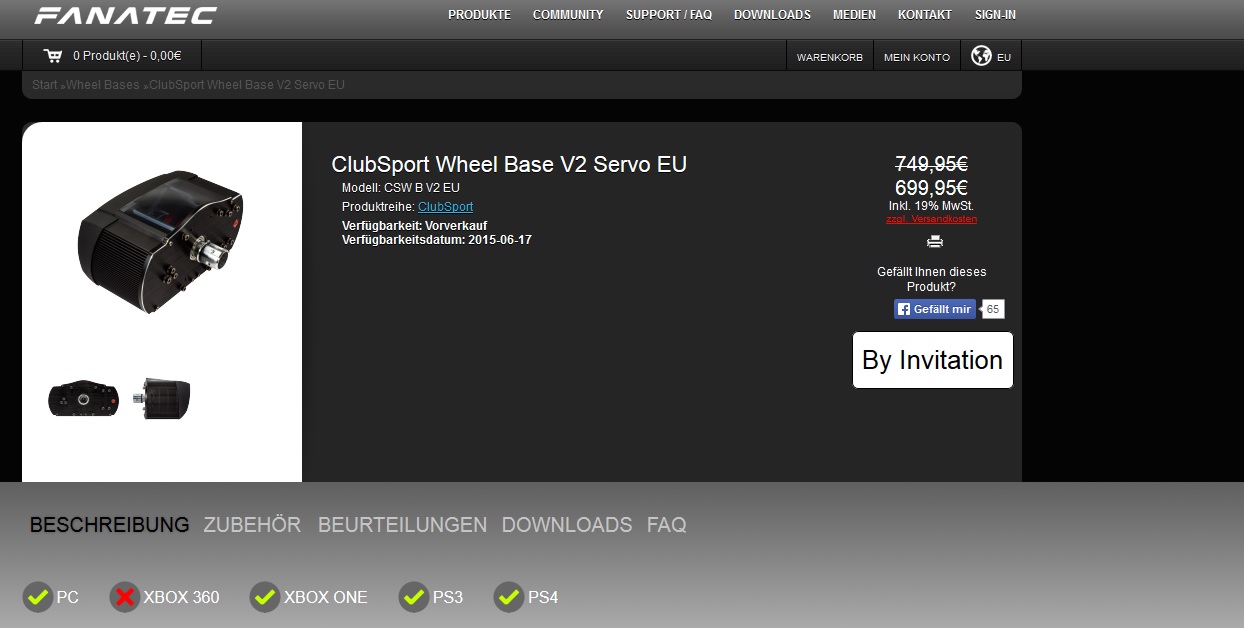 Tja, ich würds ja bestellen, aber ohne Invite-Code kann ich das nichtAktuell kostet das Wheel Base V2 lt. Fanatec Homepage wieder 699,95 €.