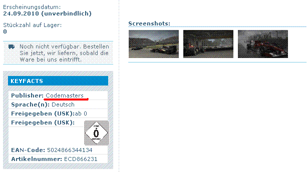 Wie wir erfahren haben, gibt es Codemasters nicht mehr als Publisher. Es werden nur noch Spiele programmiert. Das heißt, dass diese Firma nur noch als Entwickler fungiert und eine zweite Firma die Arbeit des "Publishers" übernehmen muss. In Deutschland ist dies "Koch Media". Laut Aussteller-Liste der GamesCom wird diese Firma dort vertreten sein. Ob auch F1 2010 dort sein wird, wissen wir erst später ;-)