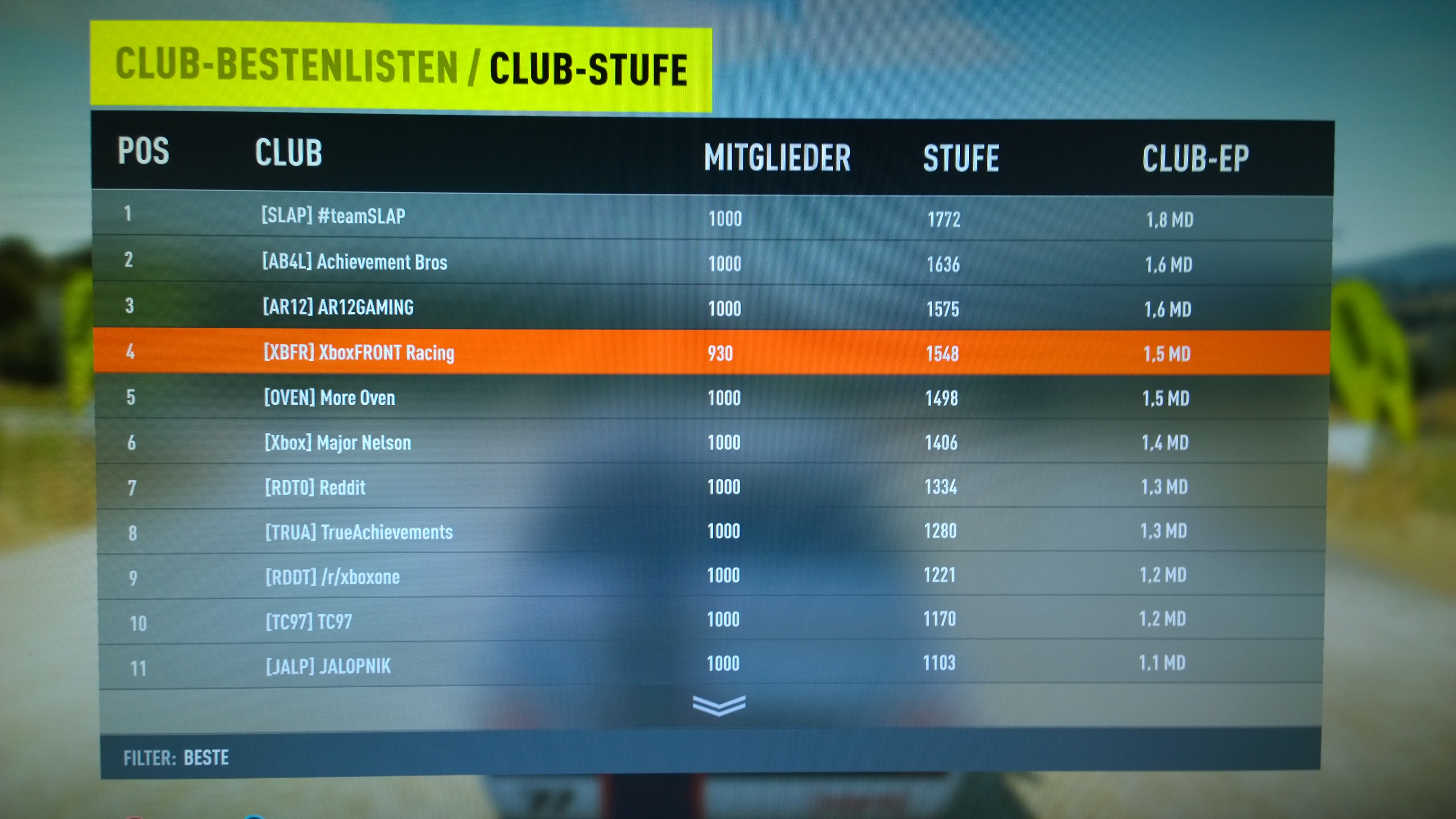 Um auf die Spielerliste zu kommen, bitte eater84 eine PM schicken. Dieser fügt euch hinzu. Wäre doch schön wenn man von den 1000 Mitgliedern doch mal ein paar kennen würdeIch möchte an dieser Stelle noch was Werbung machen für [XBFR] XboxFRONT-Racing Spielerliste (je mehr desto besser) und auch für [XBFR] Forza Horizon 2 Spielerverabredungen / Onlineveranstaltungen (hier ist regelmäßig was los)
