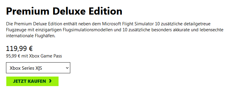 Ich kann es durch den Gamepass von meinem Sohn spielen, aber was ich nicht verstehe: wenn man Upgrade wählt steht bei allen Versionen, dass das Spiel nicht enthalten ist. Weder auf dem Ingame-Shop noch im Xbox Shop kann man das Spiel kaufen. Ist da ein Fehler in der Beschreibung und bekommt man das Spiel, wenn man die Premium Deluxe Version kauft oder sind das dann echt nur 10 Flugzeuge und 10 Flughäfen ohne Spiel?