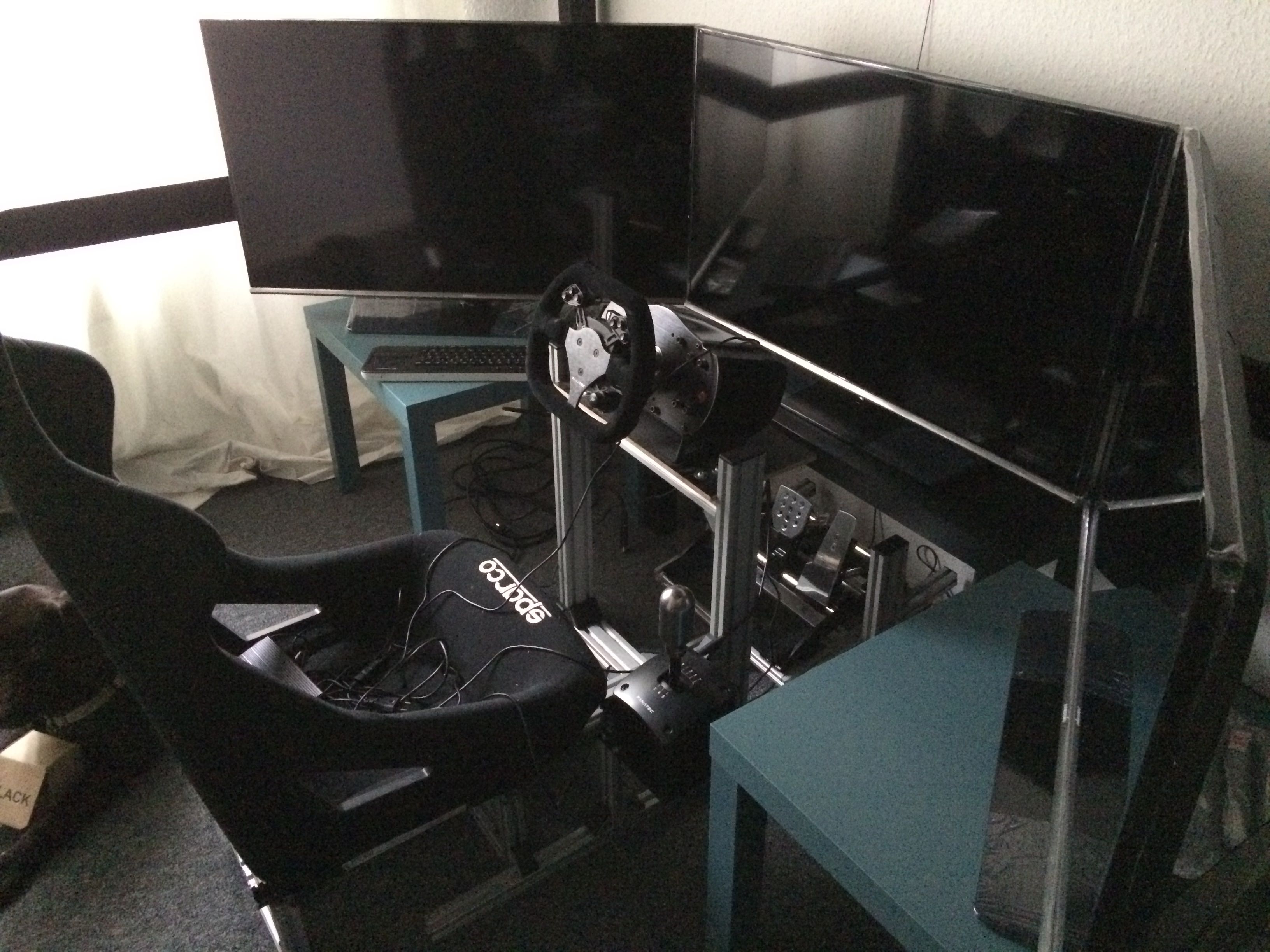 Hier mal ein aktuelles Bild meines Semi Rigs mit den neuen Bildschirmen, die erstmal provisorisch auf Tischen stehen.